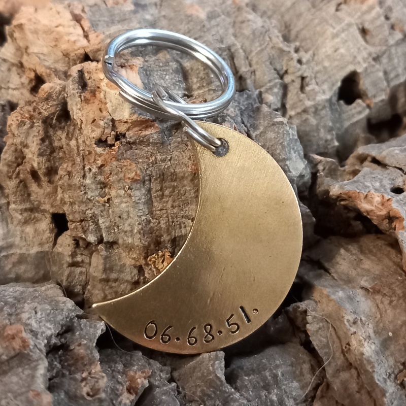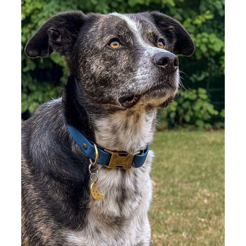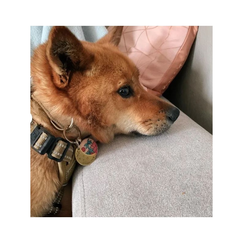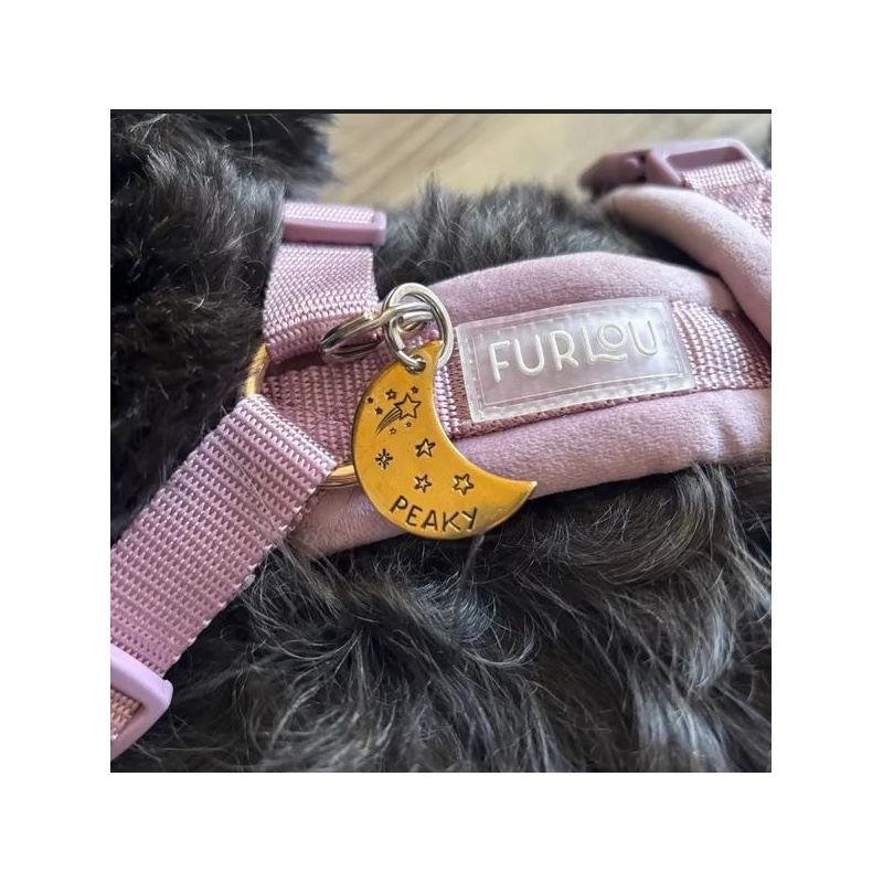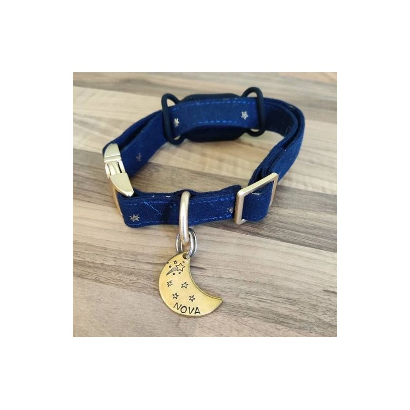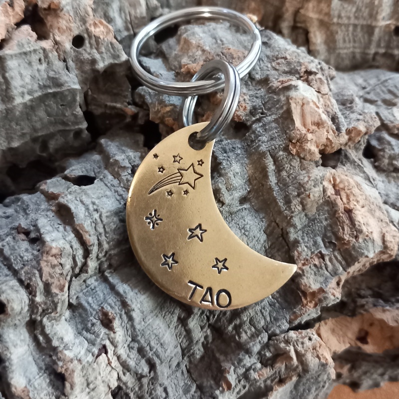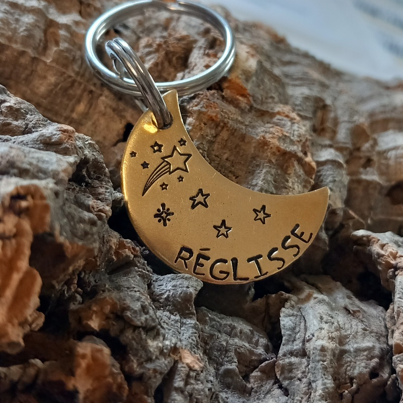 Un peu d'originalité avec cette grande médaille pour chien en forme de lune parsemée d'étoiles... Elle est idéale pour garder votre compagnon en sécurité au quotidien. Gravée à la main avec le nom de votre chien et votre numéro, elle allie simplicité, légèreté et style.