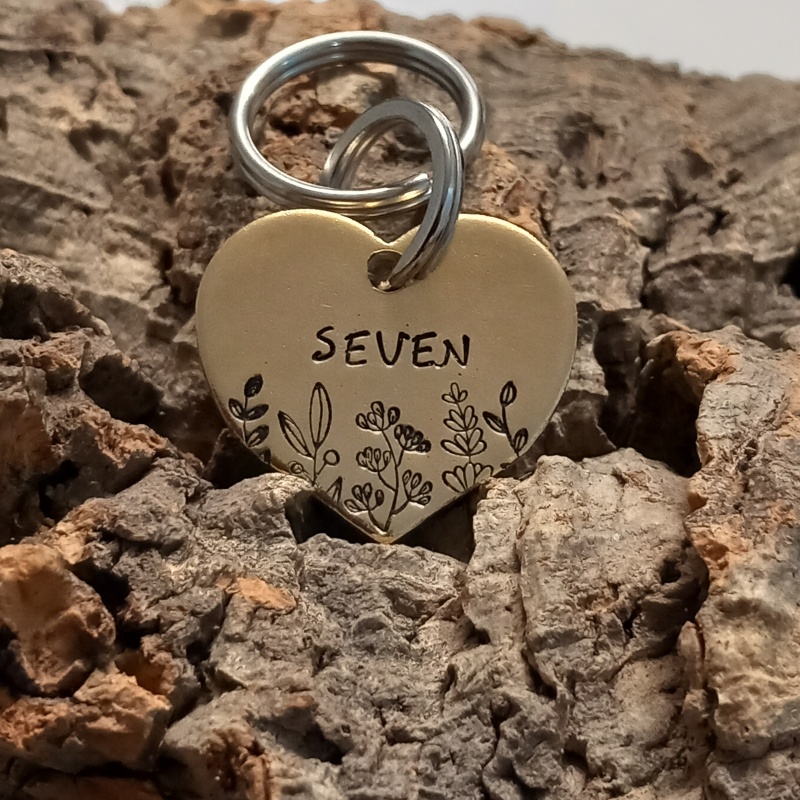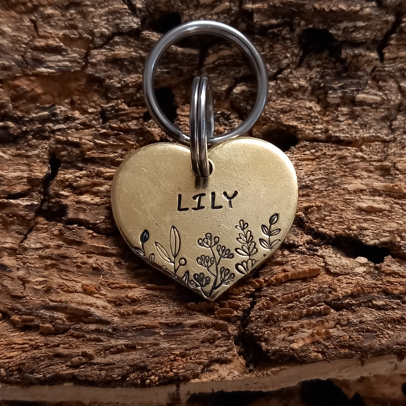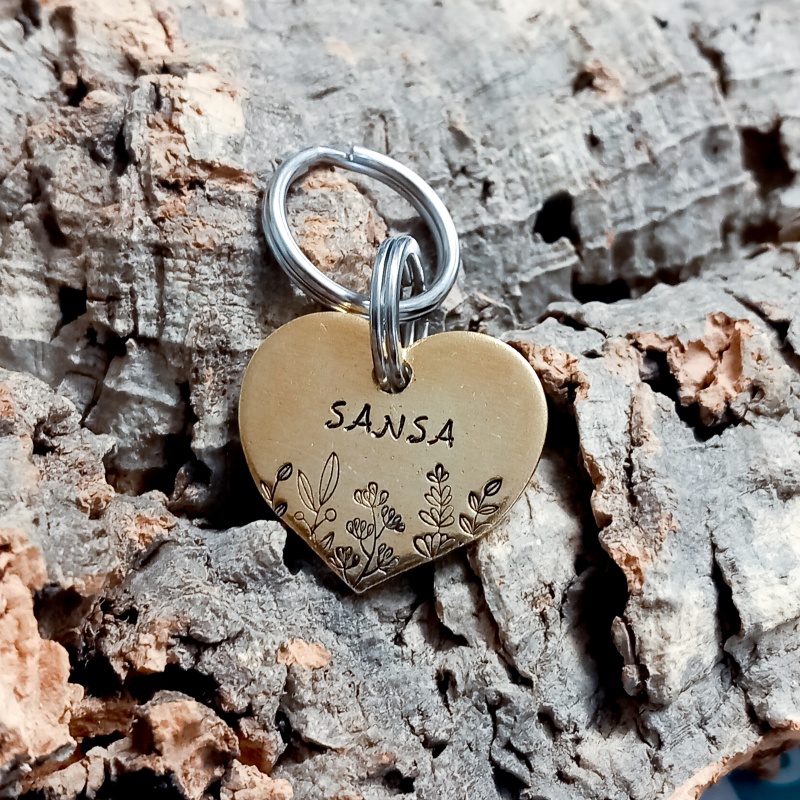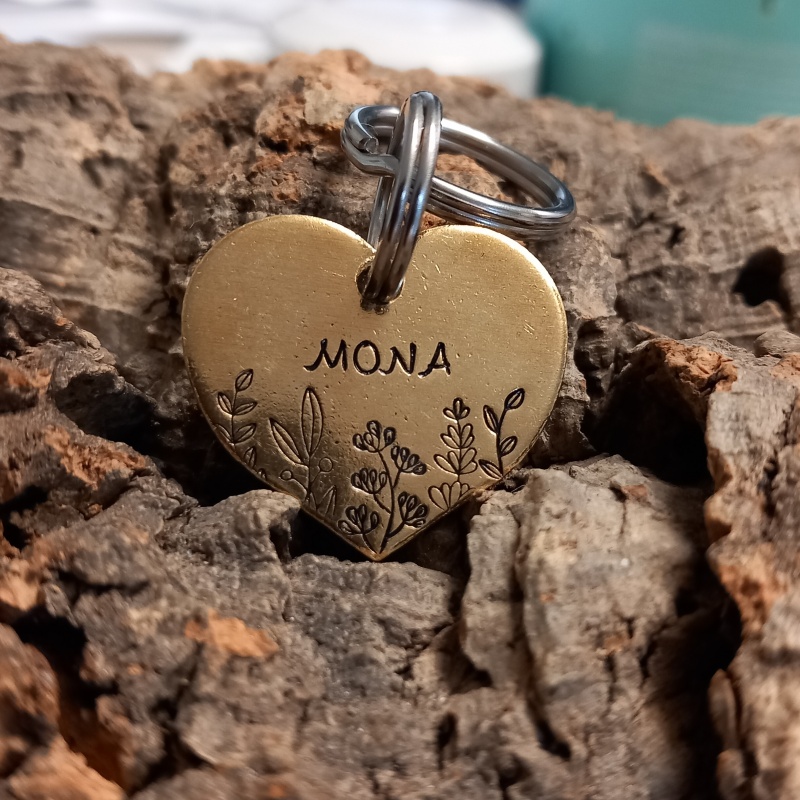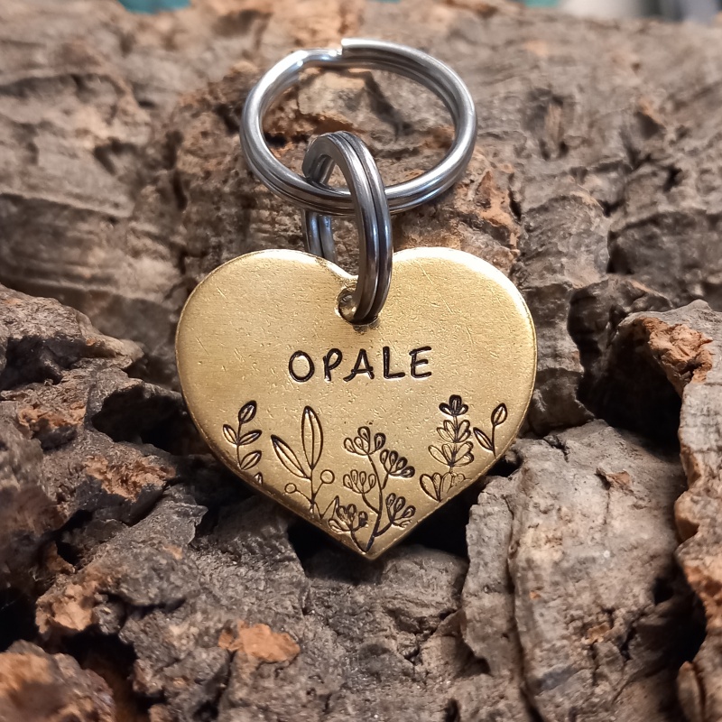 Médaille personnalisée et gravée à la main forme coeur en laiton "Athena"est idéale pour garder votre compagnon en sécurité au quotidien. Gravée à la main avec le nom de votre chien et votre numéro, cette médaille pour chien originale allie simplicité, légèreté et style.