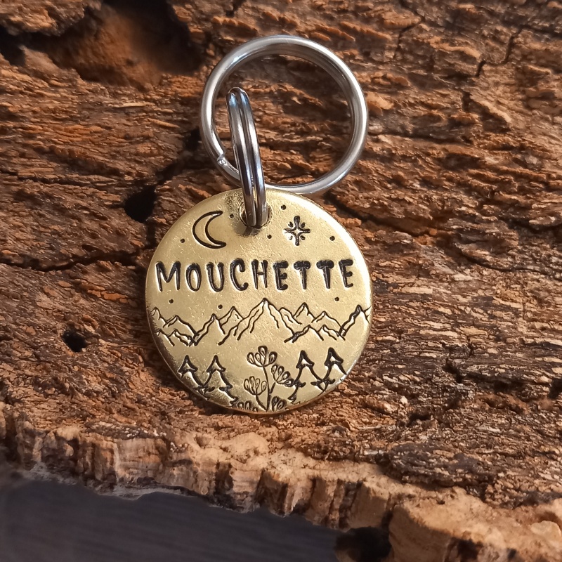 Un paysage montagneux est représenté sur cette médaille d'identité personnalisée pour chien “ Tzatziki”, elle est idéale pour garder votre compagnon en sécurité au quotidien. Gravée à la main avec le nom de votre chien et votre numéro, elle allie simplicité, légèreté et style.