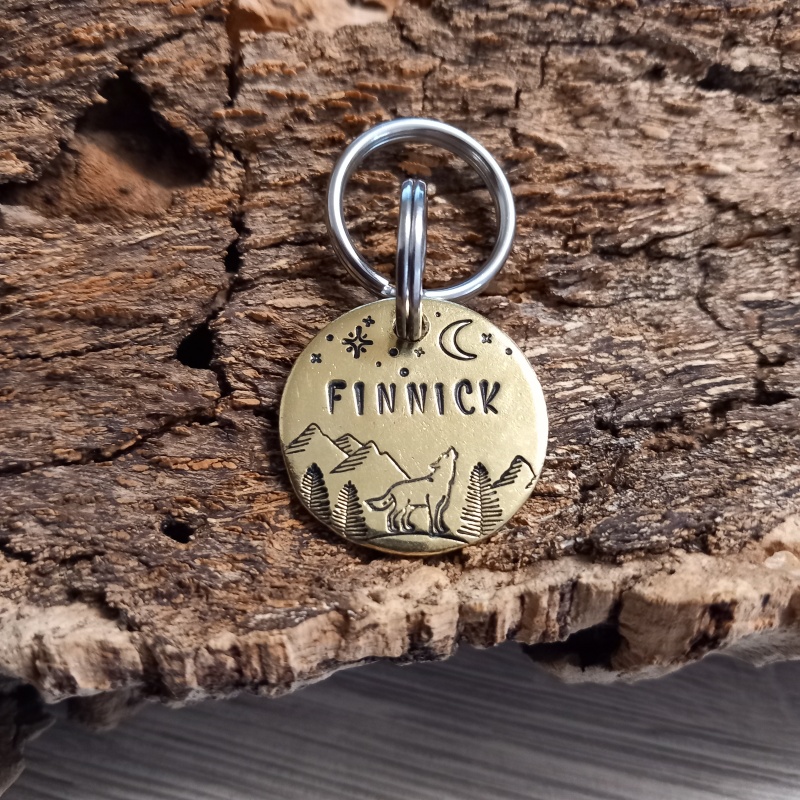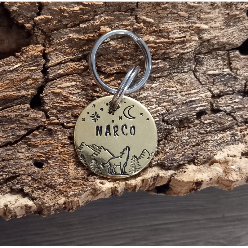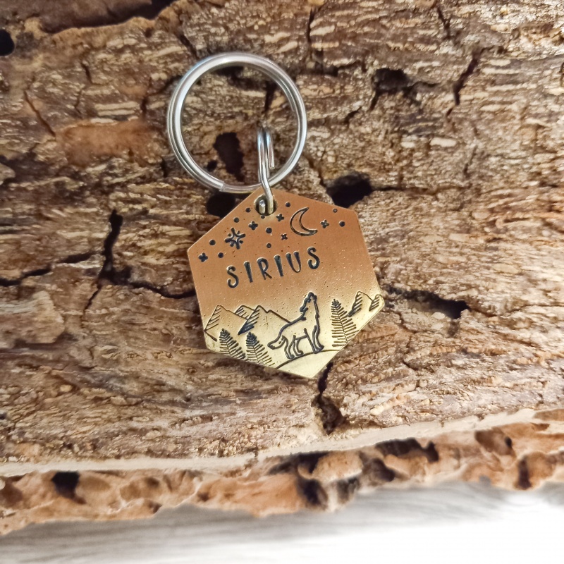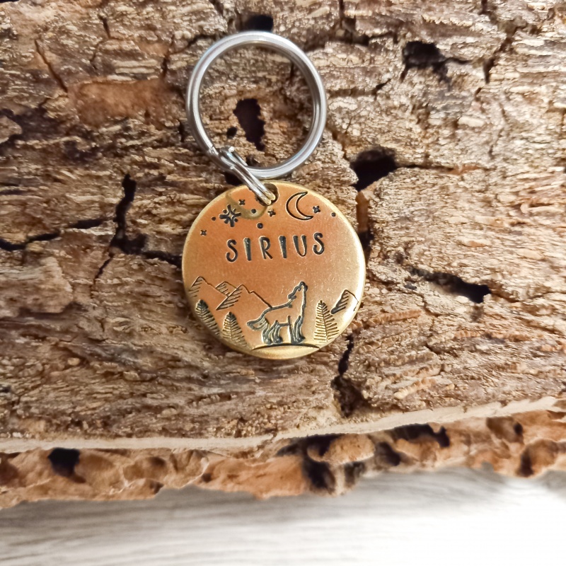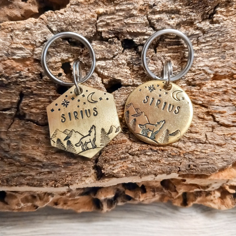 L'appel du loup sous la lune est représentée sur cette médaille d'identité personnalisée pour chien “ Sirius”, elle est idéale pour garder votre compagnon en sécurité au quotidien. Gravée à la main avec le nom de votre chien et votre numéro, elle allie simplicité, légèreté et style.