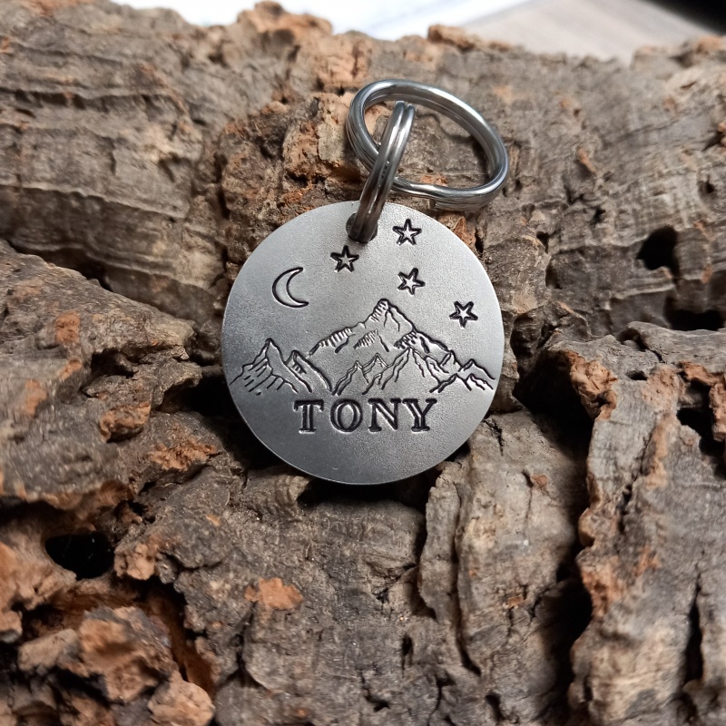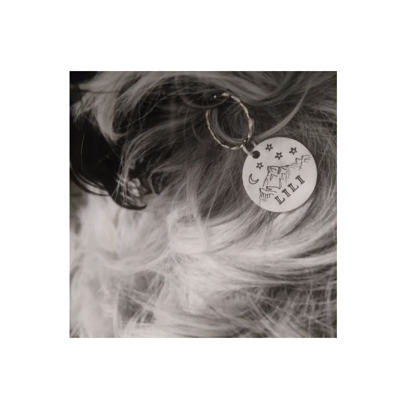 Cette médaille d'identité personnalisée pour chien “ Taki”, elle est idéale pour garder votre compagnon en sécurité au quotidien. Gravée à la main avec le nom de votre chien et votre numéro, elle allie simplicité, légèreté et style, avec son décor montagneux et une police d'écriture originale.