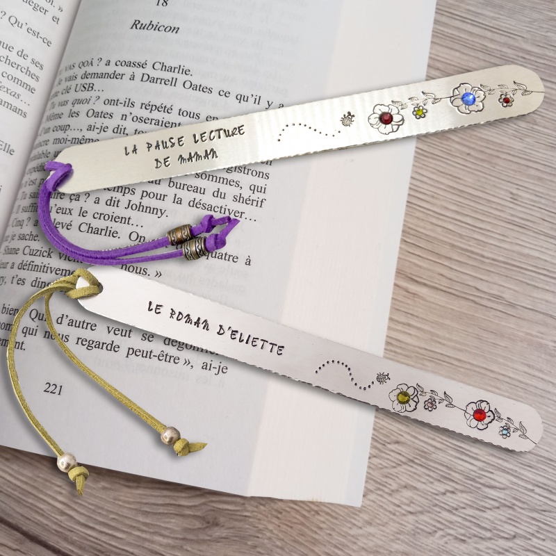 Offrez un cadeau unique et plein de charme avec ce marque-page très féminin en aluminium, gravé à la main et entièrement personnalisable. Chaque pièce est réalisée artisanalement dans notre atelier, pour accompagner les moments de lecture pendant les fêtes et bien au-delà.