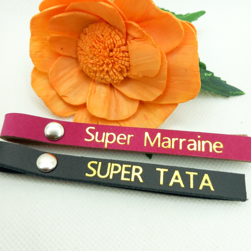 Cuir vachette lisse et coloré : marquage feuille doré réalisé avec une presse à chaud.